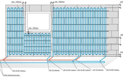Za ogrevanje se uporabljajo PERT-EOH cevi 10 mm. Zavita oblika se lahko postavi vodoravno ali navpično, odvisno od prostora, vendar se priporoča vgradnjo z čim manj zavijanja.