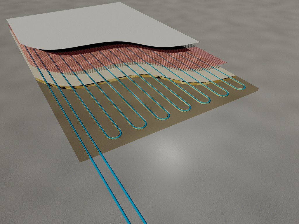 Druga stran plošče, na kateri ni cevi, je obrnjena proti sobi in ima narisano tanke črte tam kjer so položene cevi, tako da je vidno mesto na katerem se ne sme vrtati. (pri beljenju ta znak potemni)